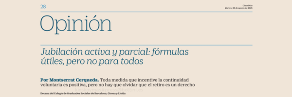 La degana dels Graduats Socials de Barcelona, Girona i Lleida, Montserrat Cerqueda, analitza i argumenta que tota mesura que incentivi la continuïtat voluntària és positiva, però no s'ha d'oblidar que retirar-se és un dret.